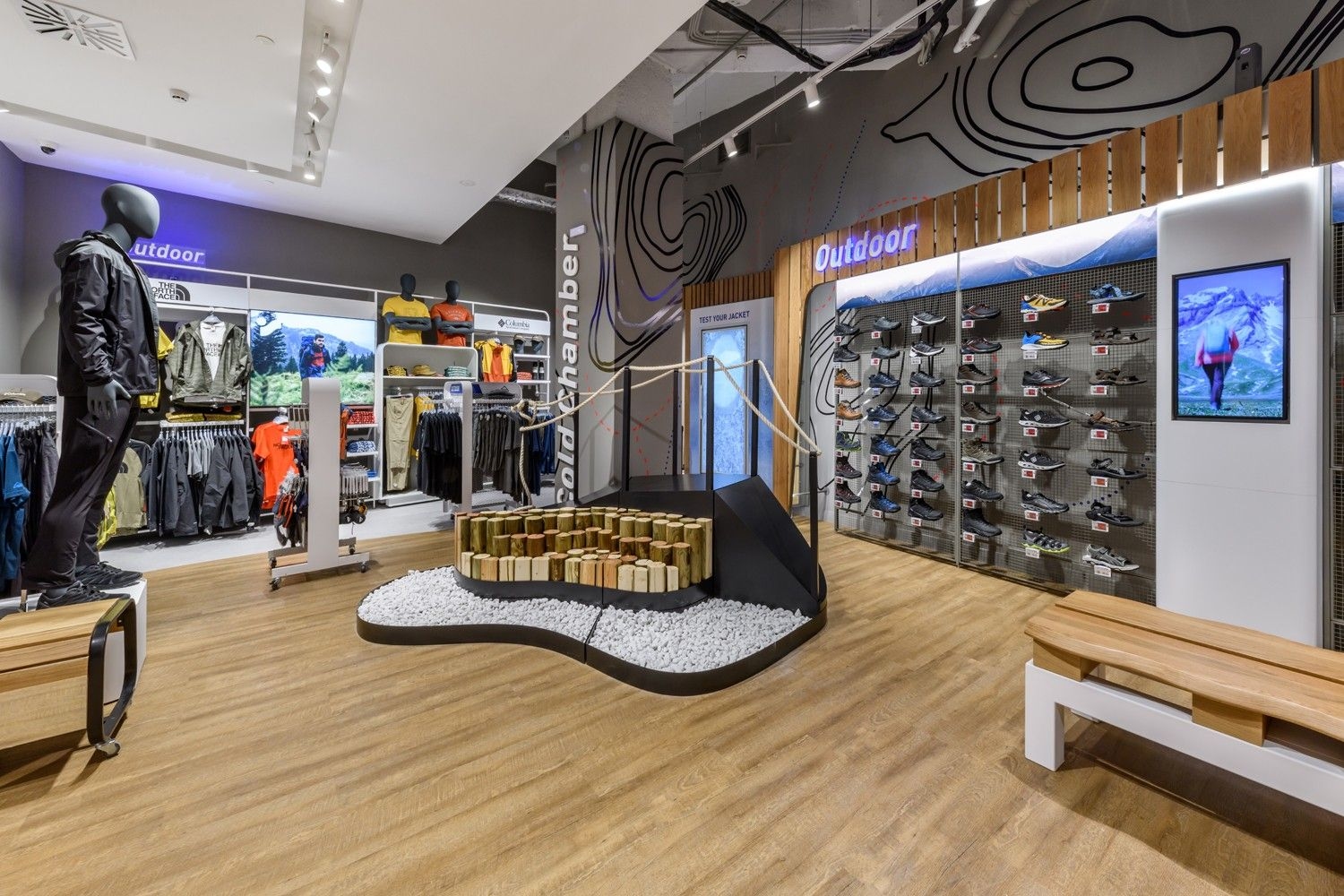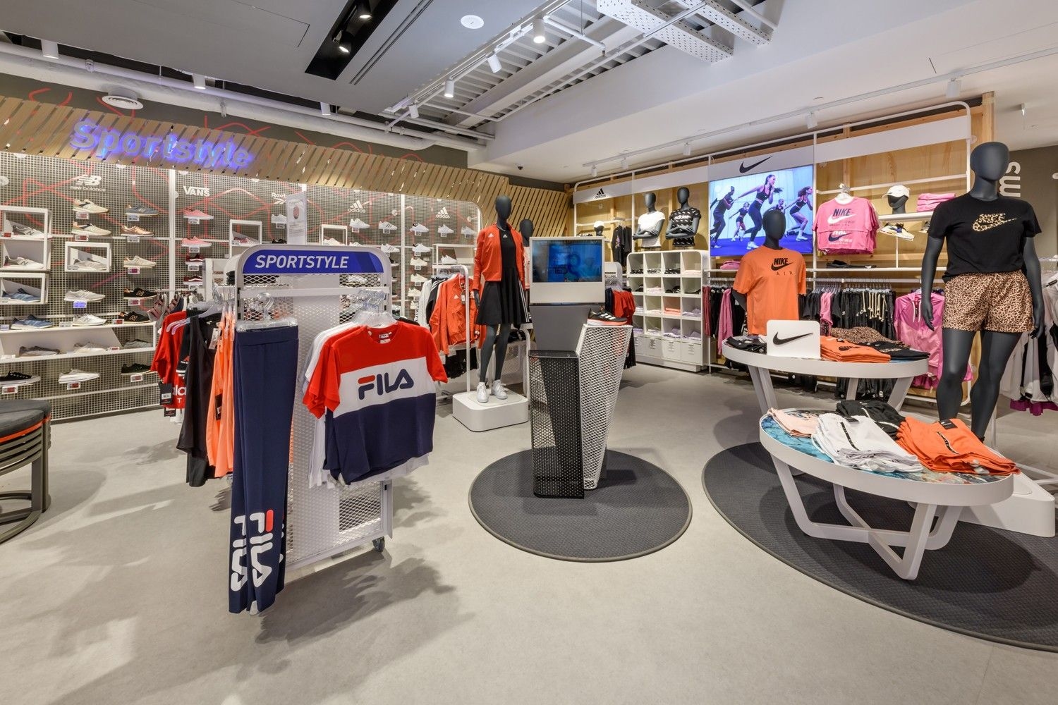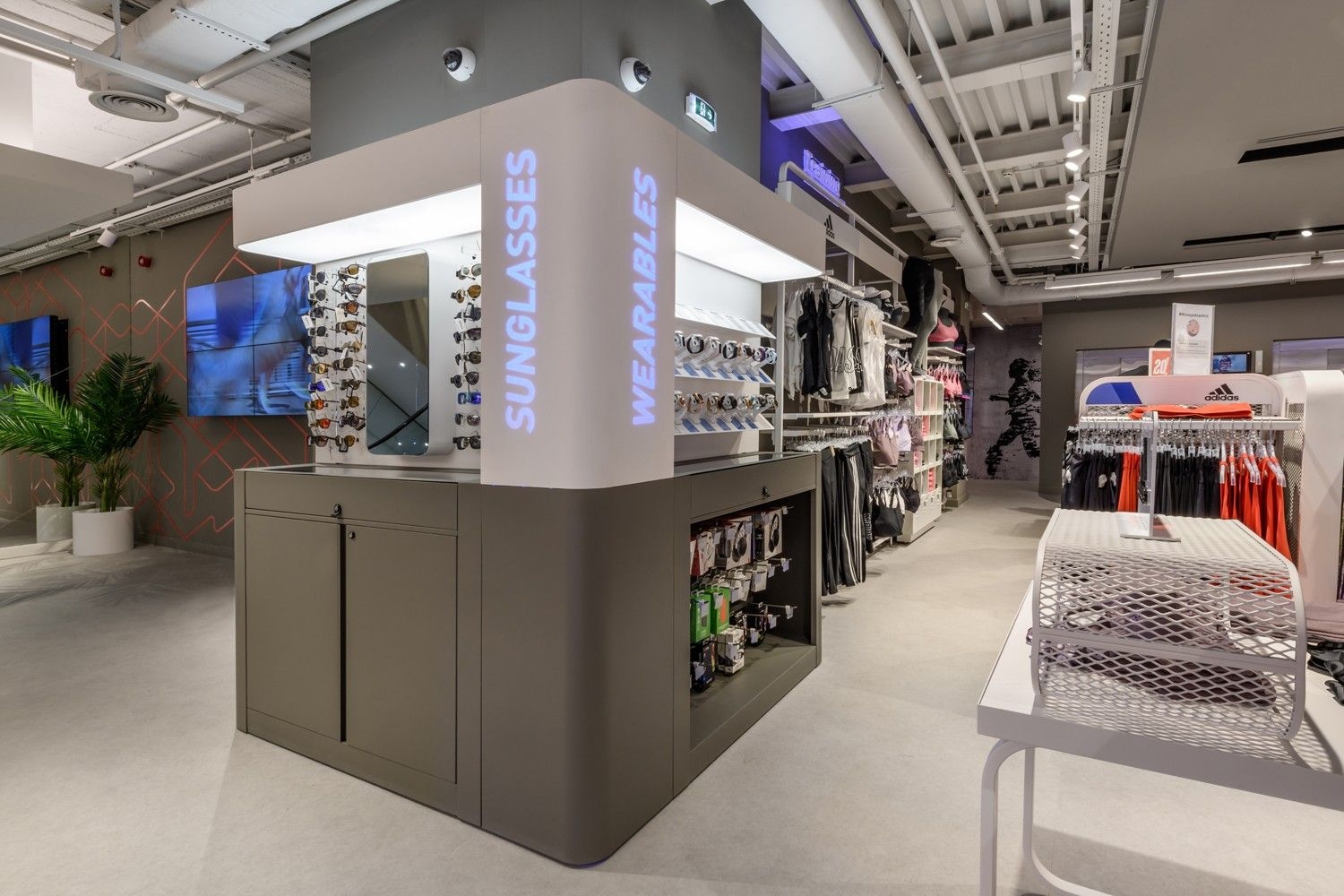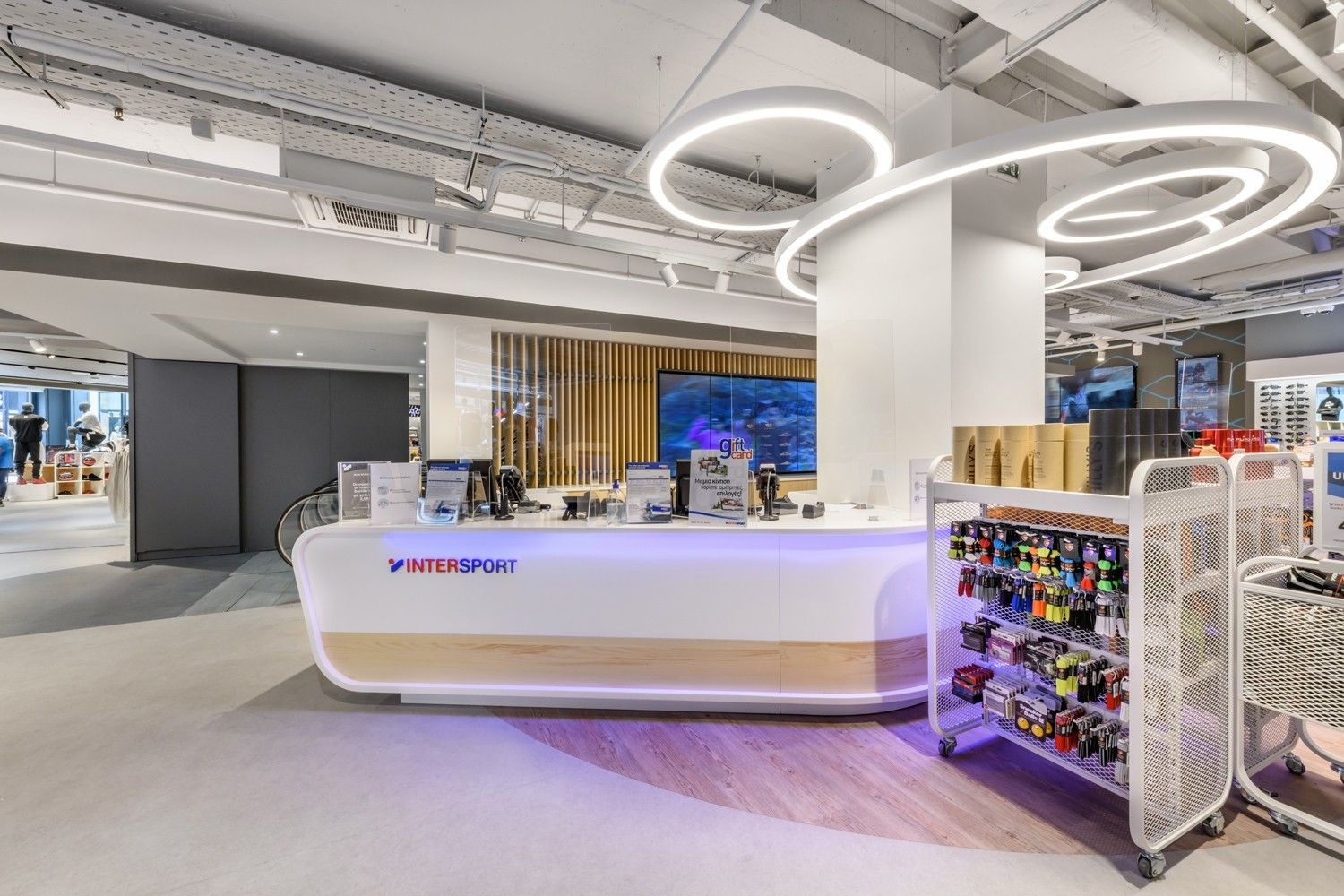 Intersport is one of our long-standing partners. Their lighting concept is based on track systems and track spotlights, complemented by decorative elements such as light rings, which give the space an elegant and sophisticated appearance. To further meet their needs, we have also developed specially designed furniture, tailored for optimal product presentation and seamless integration of lighting elements. This approach ensures functional yet visually appealing store lighting, highlighting products while creating a pleasant shopping atmosphere.